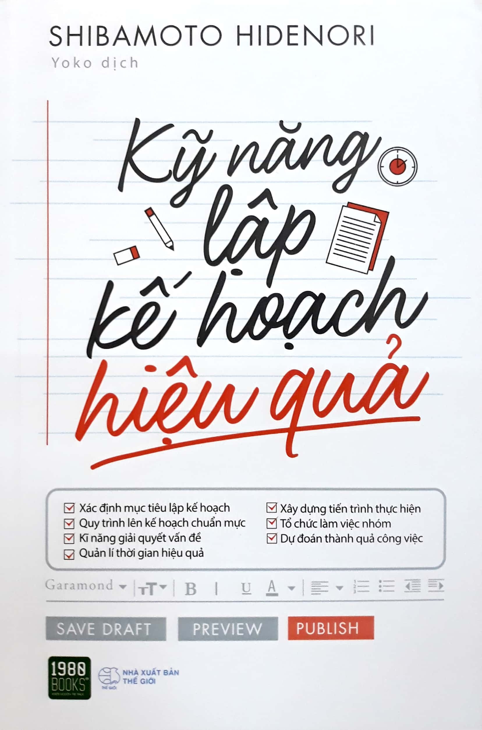 Hầu hết chúng ta đều không biết cách lập kế hoạch, và khi bị cuốn vào công việc, ta cũng hiếm khi cố gắng cải thiện điểm thiếu sót này.Vì vậy, Shibamoto Hidenori đã viết "Kỹ năng lập kế hoạch hiệu quả" để trợ giúp độc giả - đặc biệt là những người trưởng thành đã đi làm.